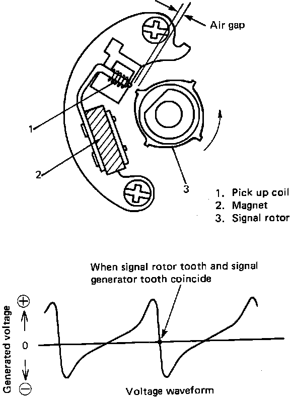 As the signal rotor turns, A/C voltage is generated in the pick-up coil which varies in pulsatory way. This pulse signal (4 per revolution) is sent to the ECM where it is used to calculate engine speed and also as one of the signal to control various devices.