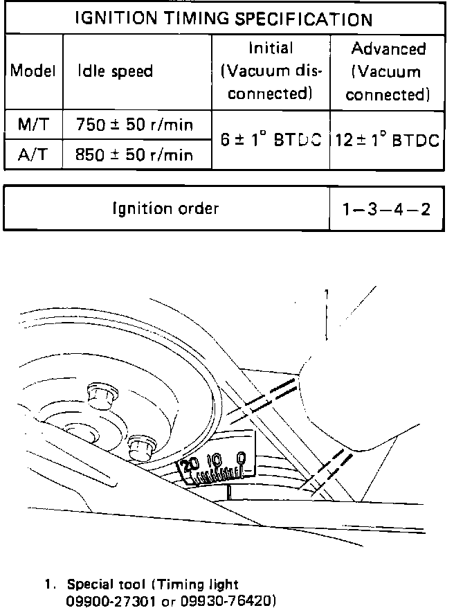 - If ignition timing is out of specification, loosen flange bolts, adjust timing by turning, distributor assembly while engine is running, and then tighten bolts.