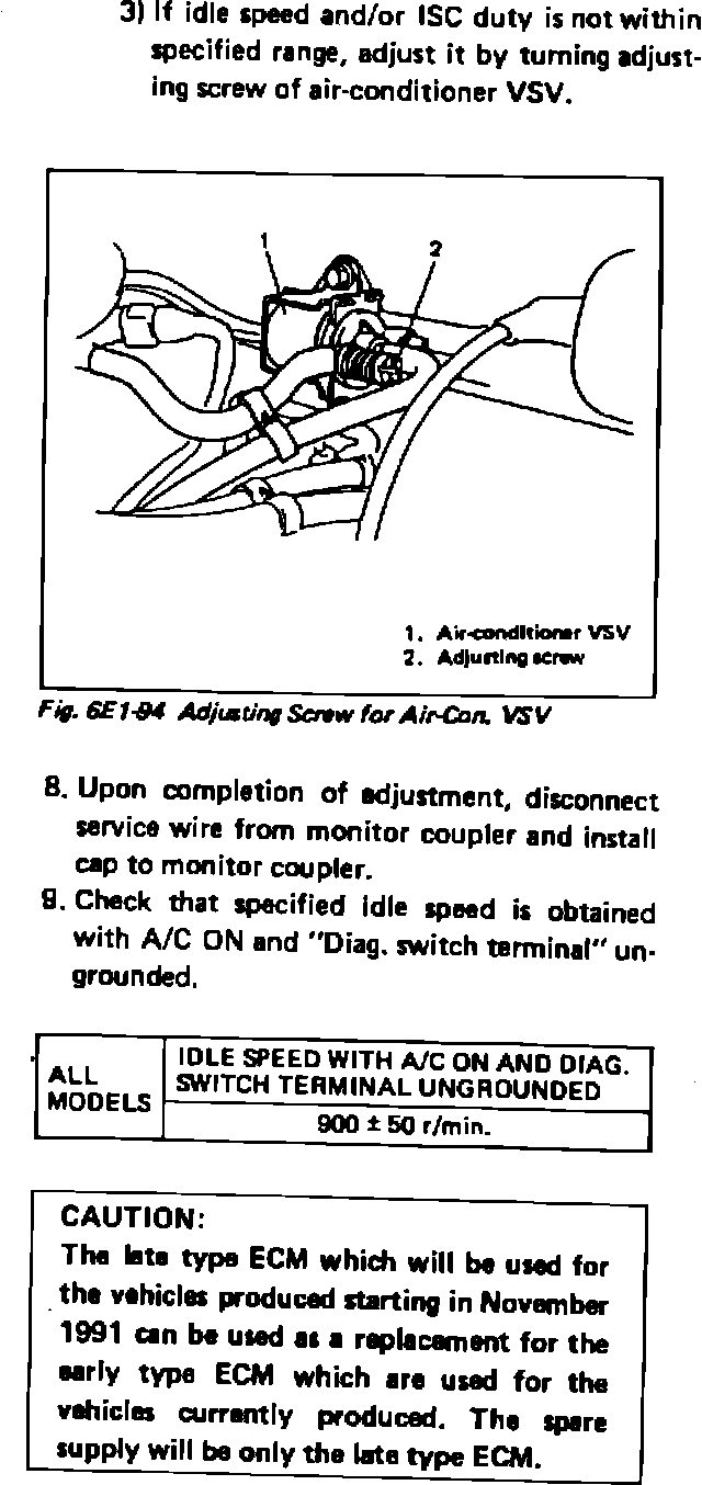The specifications and adjustment procedure on pages 6E1-70 and 6E1-71 of the 1992 Supplementary Service Manual (99501-64B10-33E) for the idle speed and idle speed control(ISC) duty have been updated. The updated specifications and procedure are listed. Be sure to update your manual accordingly.