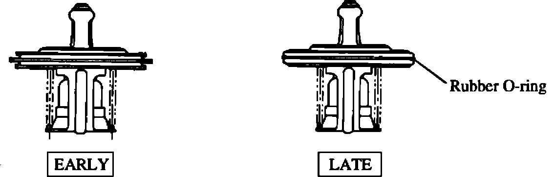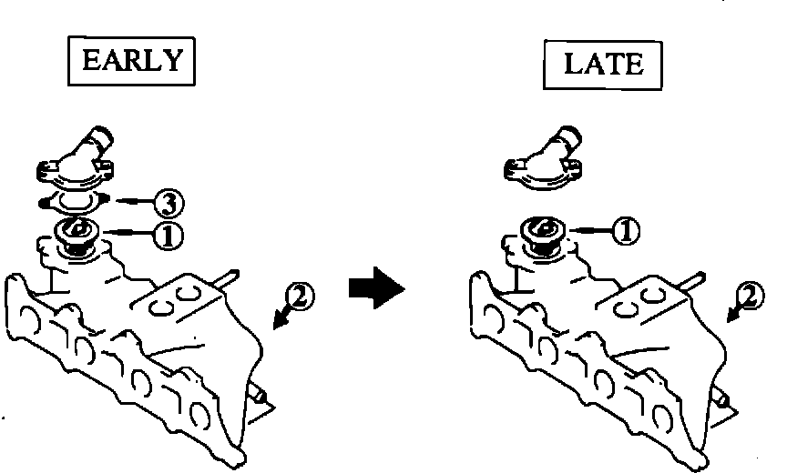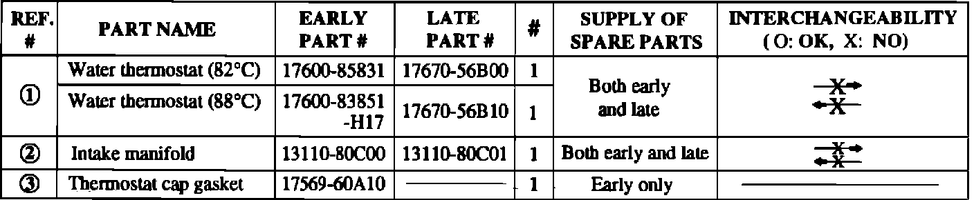 This bulletin is to inform you of the modification in the intake manifold and thermostat which has been carried out since June 1992 production. The thermostat mounting surface and port on the intake manifold have been enlarged in diameter to accommodate a new-style thermostat with an O-ring. Since the latestyle thermostat is not interchangeable with the early-style manifold, use the late-style thermostat only with the late-style manifold.