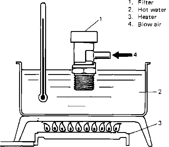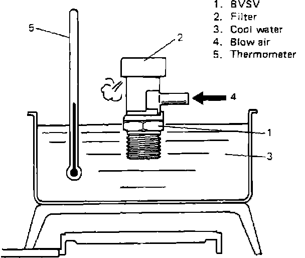 4. While keeping BVSV warm (above 6O° C (140° F)) in hot water, blow nozzle. Air should not come out of filter.