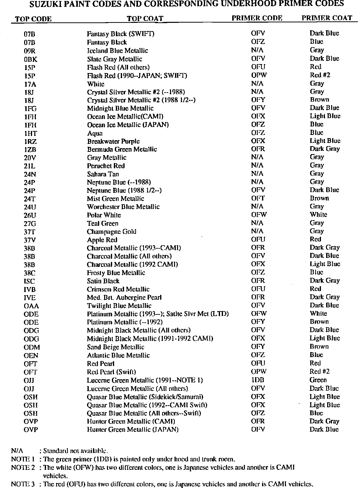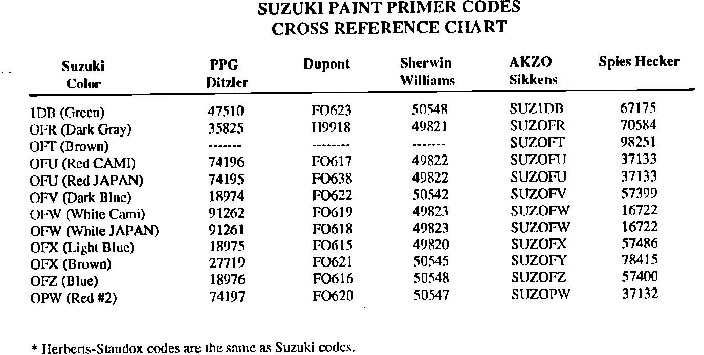 Select the proper Suzuki colorcoat code and look across the chart to find the correct corresponding underhood primer code.