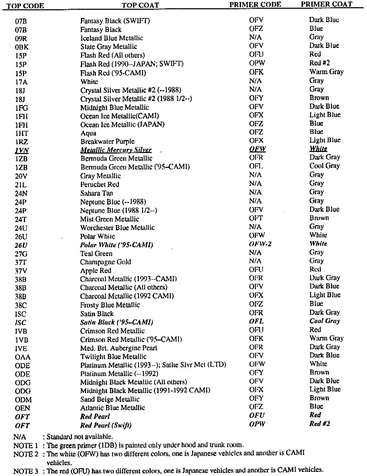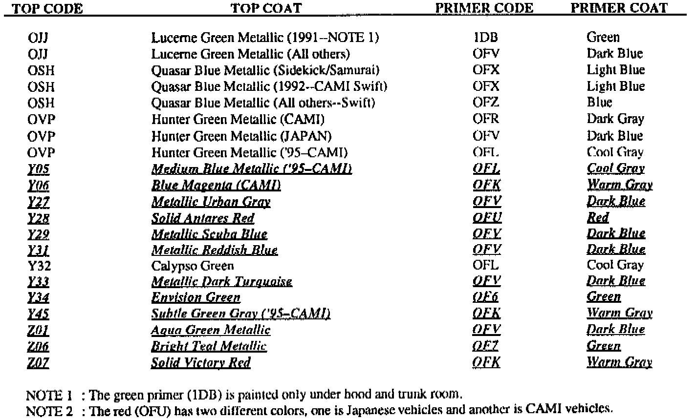 ^ Correction of applicable 1996 color codes. The 1996 codes are in bold italics; new codes for 1996 are in bold underlined italics.