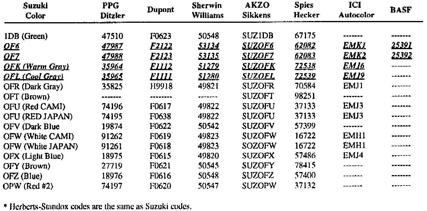 SUZUKI PAINT CODES AND CORRESPONDING UNDERHOOD PRIMER CODES