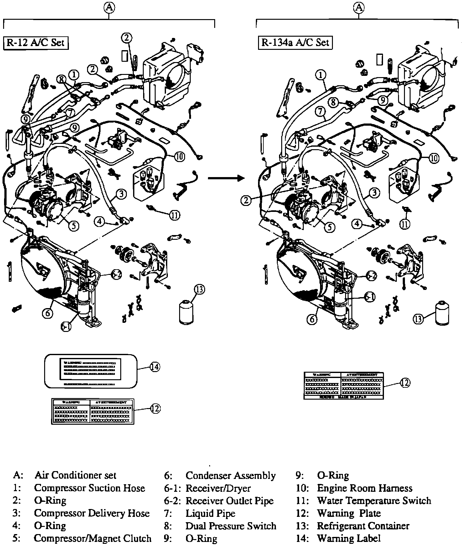 ^ Both A/C system (R134a and R-12) use different types of compressor oil and refrigerant. Using the inappropriate part for the installed A/C system will cause damage to the A/C system, resulting in refrigerant leakage into the atmosphere.