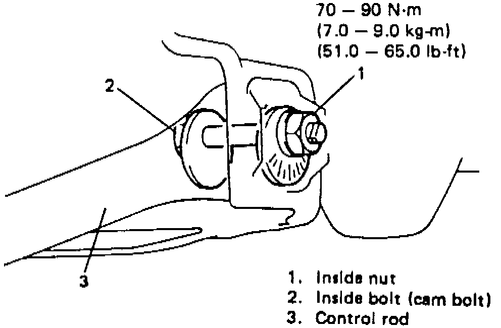 3. After adjustment, torque right and left inside nuts to 51-65 ft. lbs., while holding cam bolt with another wrench to prevent it from turning.