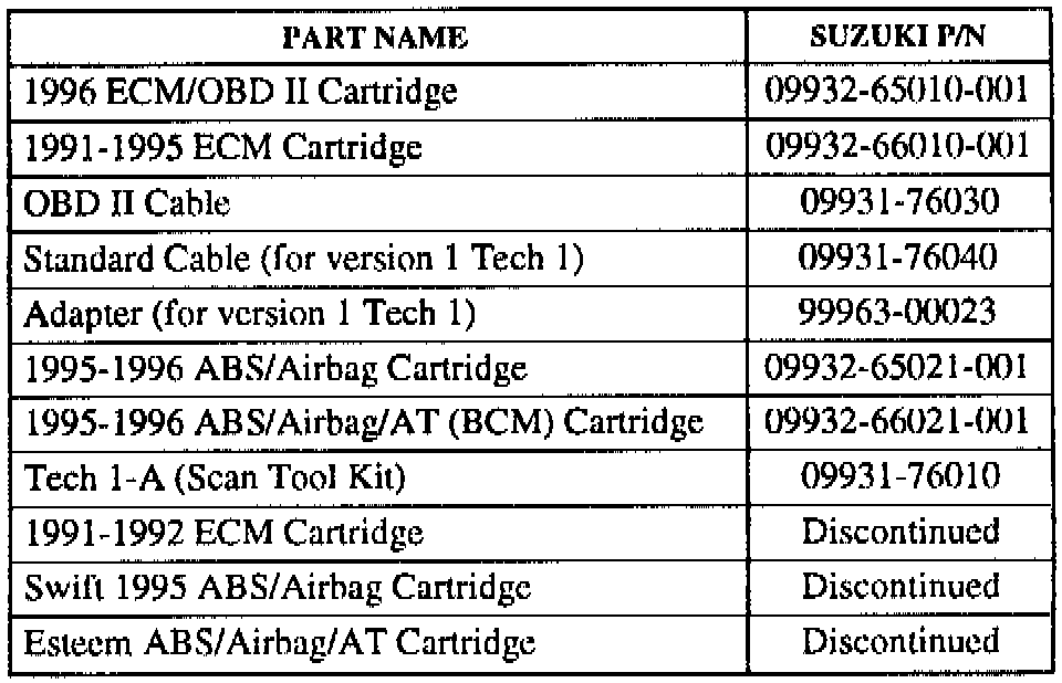 ^ THE 1991-1994 SUZUKI CARTRIDGE (09932-66010-001) MAY BE USED ON 1995 MODEL VEHICLES IF YOU ENTER 1994 IN THE TECH 1-A FOR THE YEAR OF THE VEHICLE. NO SELF-ADHESIVE LABELS REFLECTING THESE UPDATES WILL BE AVAILABLE