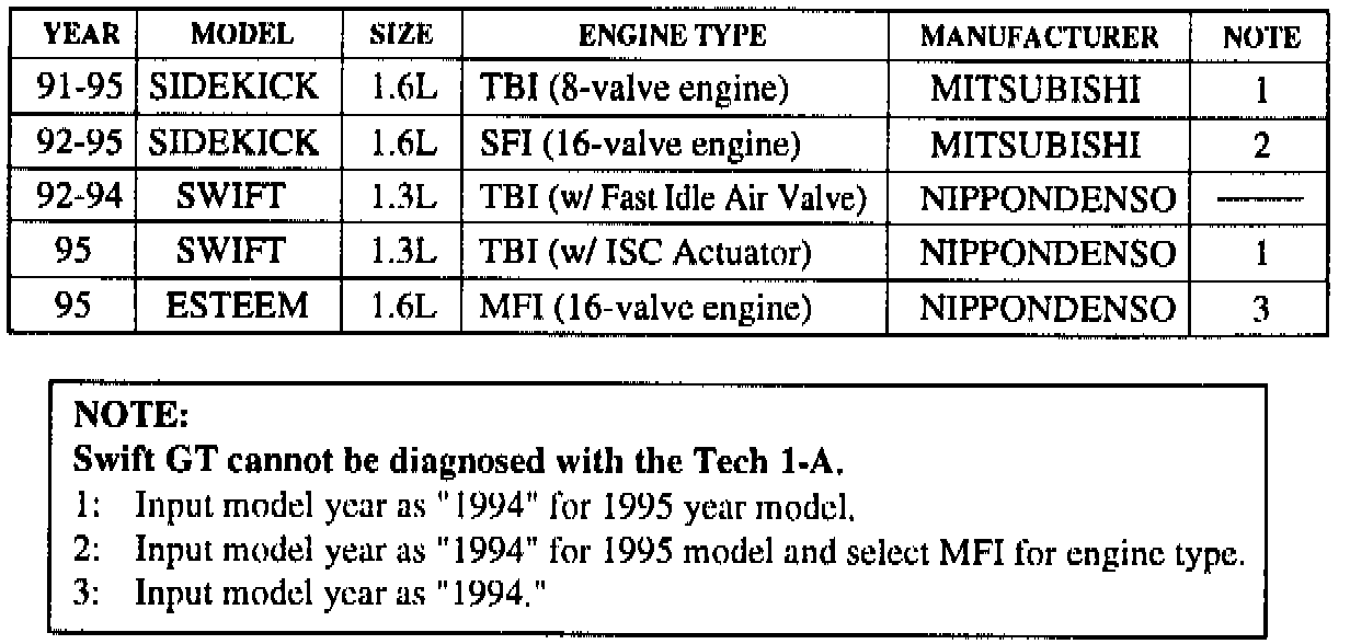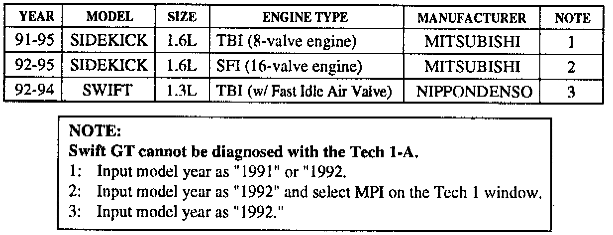 ^ THE 1991-1995 SUZUKI CARTRIDGE (09932-66010-001) WILL NOT SUPPORT THE 1991- 1994 SWIFT GT (DOHC).