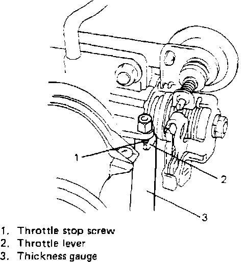 3. Insert 0.65 mm (0.025 in) thickness gauge between throttle stop screw and throttle lever.