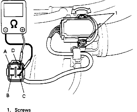 5. First, turn TPS clockwise fully and then counterclockwise gradually to find position where ohmmeter reading changes from 0 (Zero, continuity) to (no continuity). Then fix TPS at that position by tightening screws to specified torque.