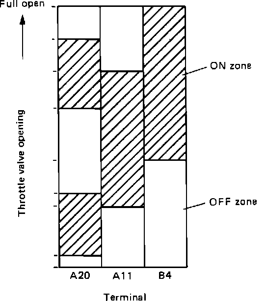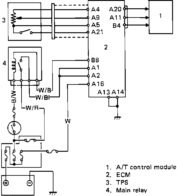 Receiving the throttle valve opening signal from the throttle position sensor, ECM converts it into the three ON/OFF signals and sends them to A/T control module through A2O, A11, and B4 terminals. Then A/T control module uses them as the signals to control the automatic transmission.