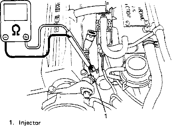 - Disconnect coupler from injector, connect ohmmeter between terminals of injector and check resistance.
