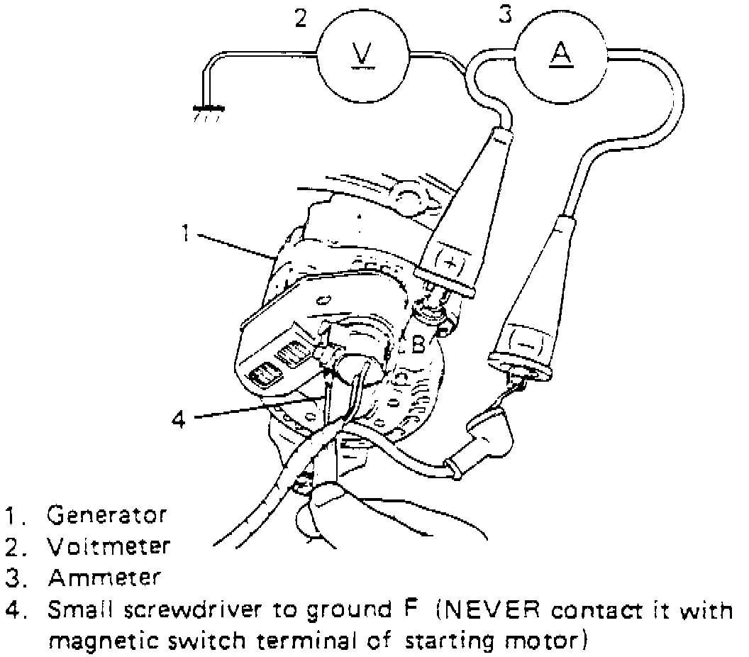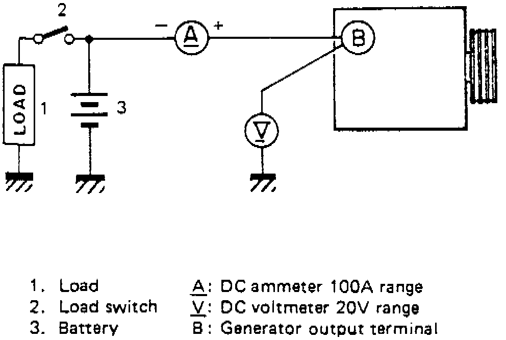 4. Connect a suitable voltmeter and ammeter as shown, Fig. 2. Connect voltmeter between alternator B terminal and ground. Connect ammeter between alternator B terminal and battery positive terminal.