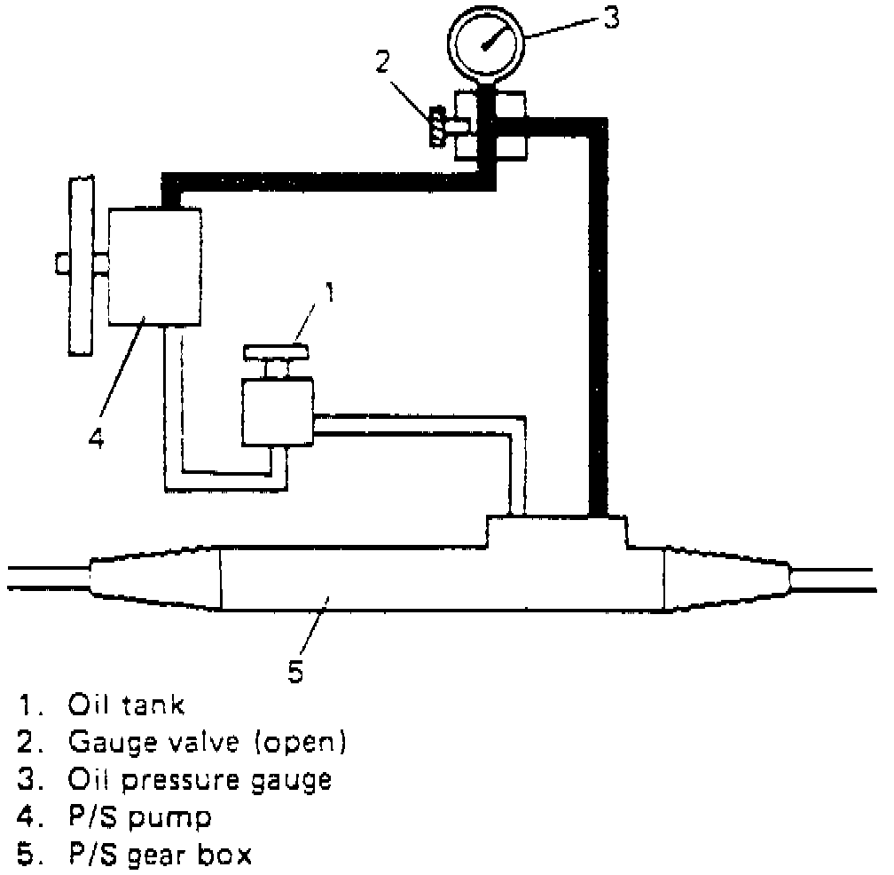 4. With wheels straight forward and engine running at idle, check backpressure on gauge, pressure should be lower than 142 psi. If pressure is higher than 142 psi, check control valve and pipes for obstruction.