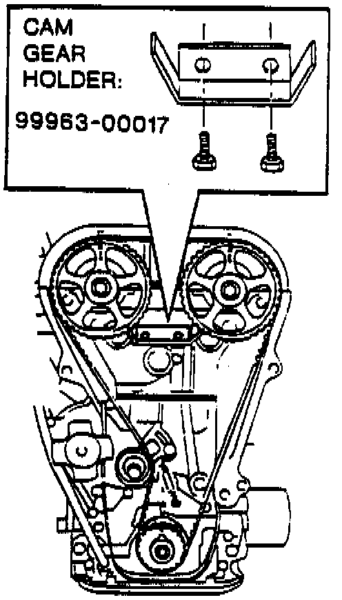 Suzuki has developed a new special tool to help with removing and installing cam belts on Dual Over Head Cam Swifts. The Cam Gear Holder bolts to the head and holds the cam gears in position so the belt can be installed easily (see illustration to the right). It is also useful when loosening or torquing the cam gear bolts.