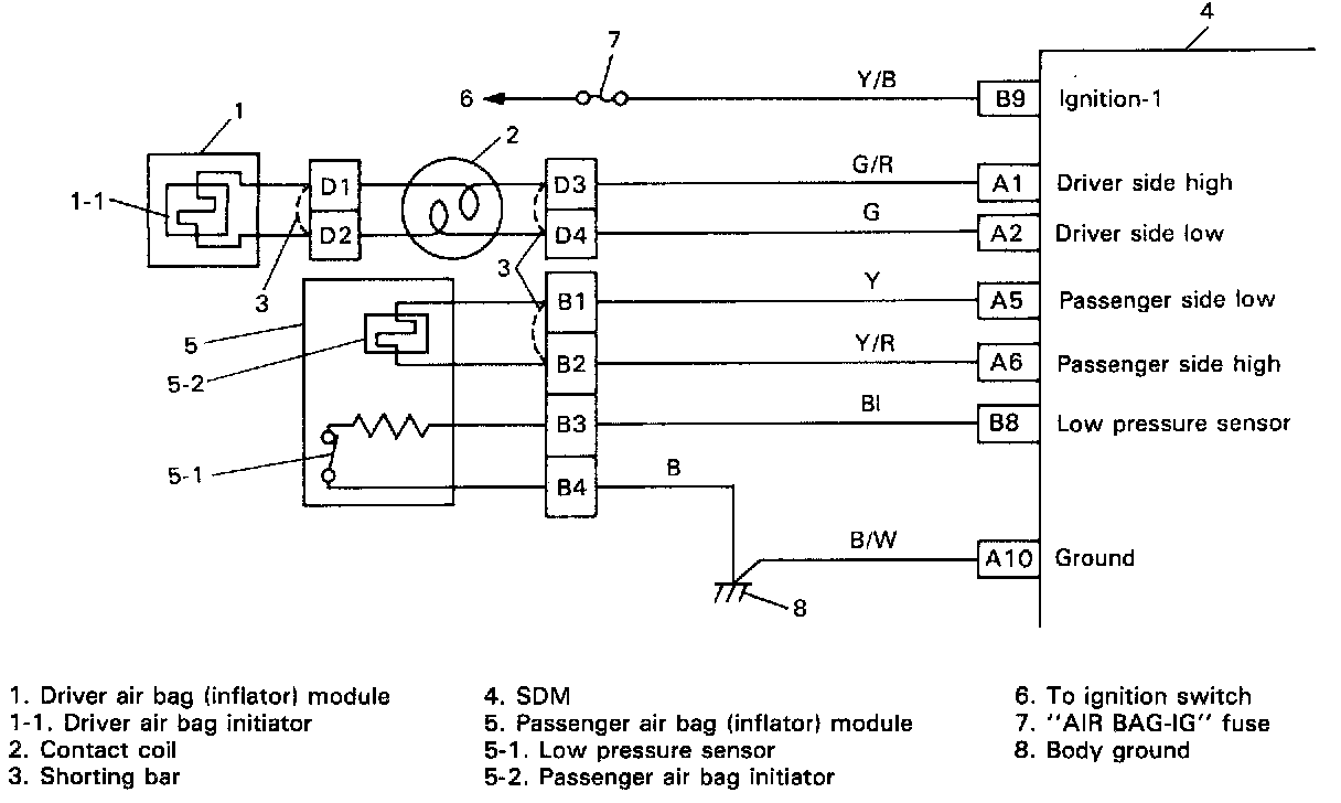 - When the ignition switch is turned "ON," the SDM will perform tests to diagnose critical malfunctions within itself. Upon passing these tests "Ignition 1", reserve and deployment loop voltages are measured to ensure they are within their respective normal voltage ranges. The SDM then proceeds with the "Current Source Diagnostics." "Passenger Side Low" terminal "A5" is grounded through a resistor and the passenger current source connected to "Passenger Side High" terminal "A6" allows a known amount of current to flow. After "Current Source Diagnostics" are completed the SDM removes the low resistance ground from "Passenger Side Low" and switches the passenger current source at "Passenger Side High." The SDM then measures the voltage at "Passenger Side High" and "Passenger Side Low" during "Continuous Monitoring." By monitoring the voltage difference between "Passenger Side High" and "Passenger Side Low" the SDM calculates the combined resistance of the passenger air bag (inflator) module, harness wiring and connector terminal contact.