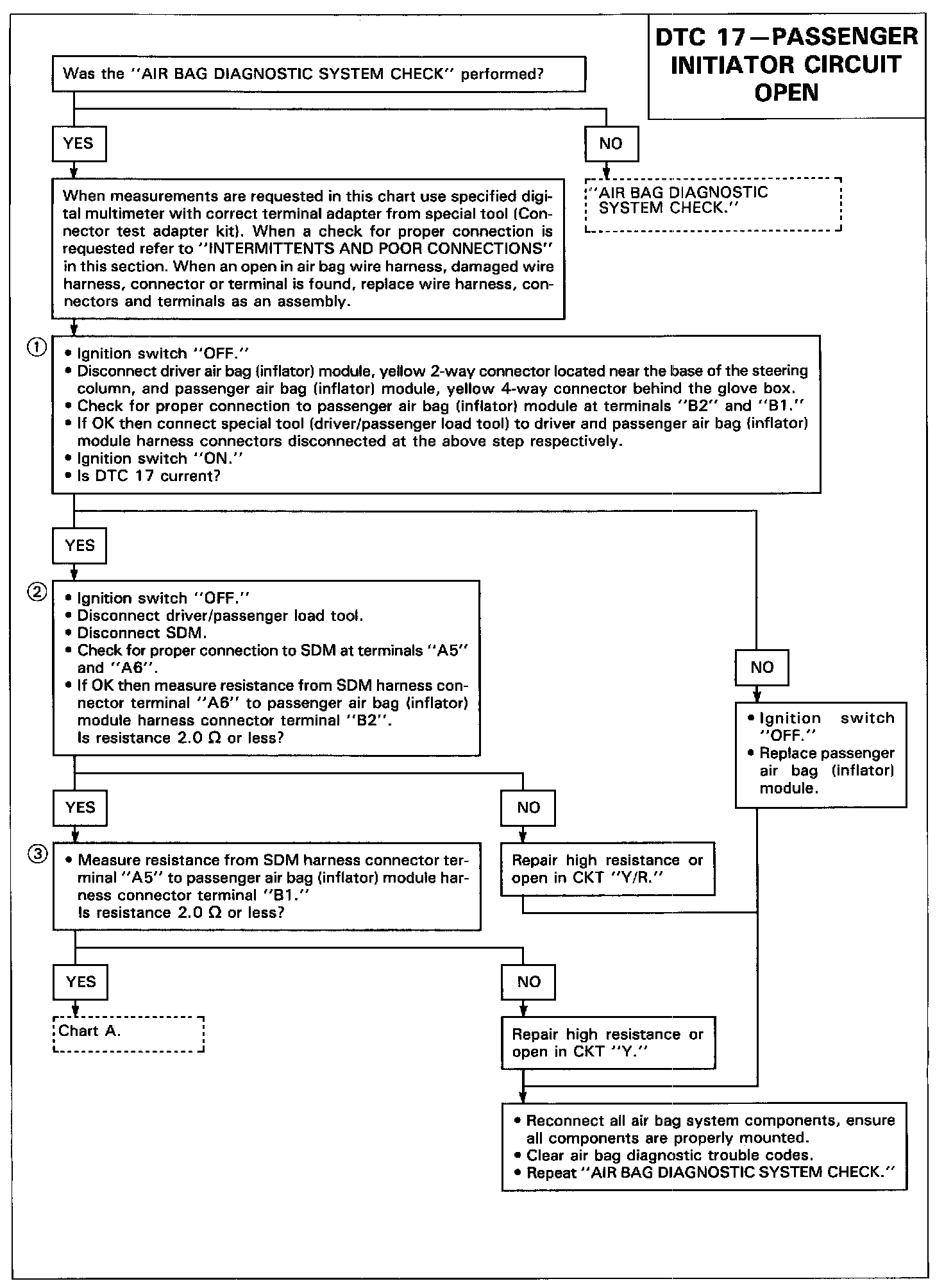 DIAGNOSTIC AIDS: An intermittent condition is likely to be caused by a poor connection at the passenger air bag (inflator) module harness connector terminals "B2" and "Bi", SDM terminals "AS" and "A6", or an open in CKT "Y/R" or CKT "Y."