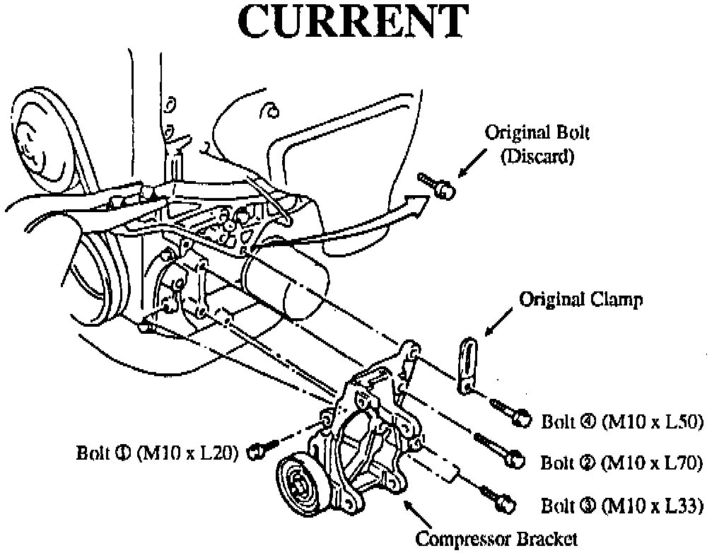 The 1995 Swift Manual describes installation of the compressor bracket onto the engine block with the original clamp using five bolts. When installing the compressor bracket onto the engine block, bolt # 1 (M8 x L20) will no longer be required for assembly.