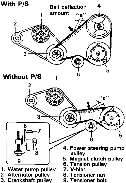 2) Check belt tension by measuring how much it deflects when pushed at intermediate point between Power Steering (P/S) pump pulley and crank pulley with about 10 kg (22 lb) force.