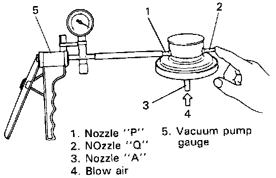 3. Connect vacuum pump gauge to nozzle "P" and plug nozzle "Q" with finger. While blowing air into nozzle "A", operate vacuum pump gauge and check that vacuum is applied to pressure transducer. Then stop blowing nozzle "A" and check that vacuum pump gauge indicates "0" (zero). If check result is not satisfactory, replace EGR pressure transducer.
