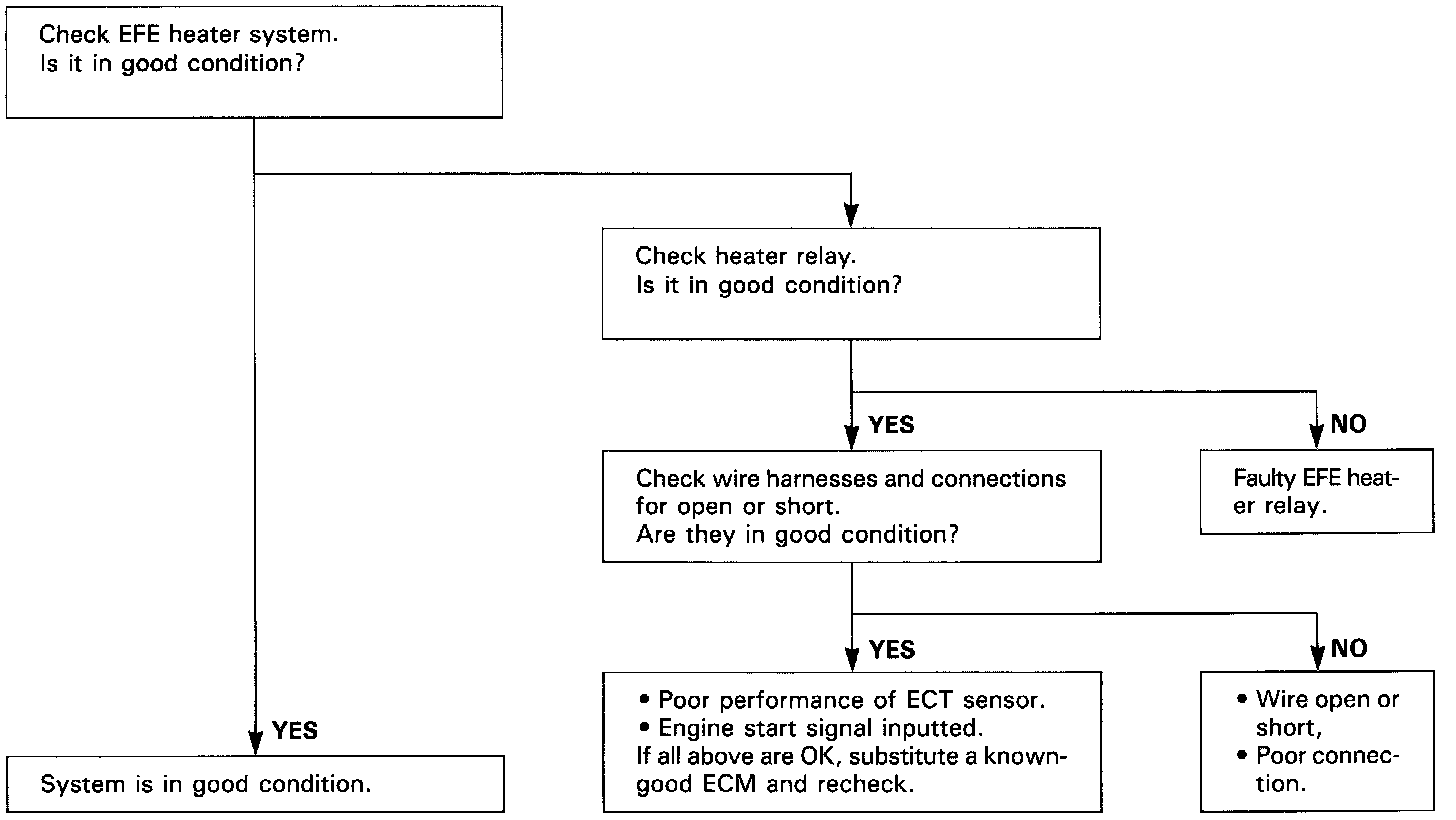 NOTE: Before using following flow chart, check to make sure that battery voltage is higher than 11V. If battery voltage is low, ECM does not turn EFE heater ON.
