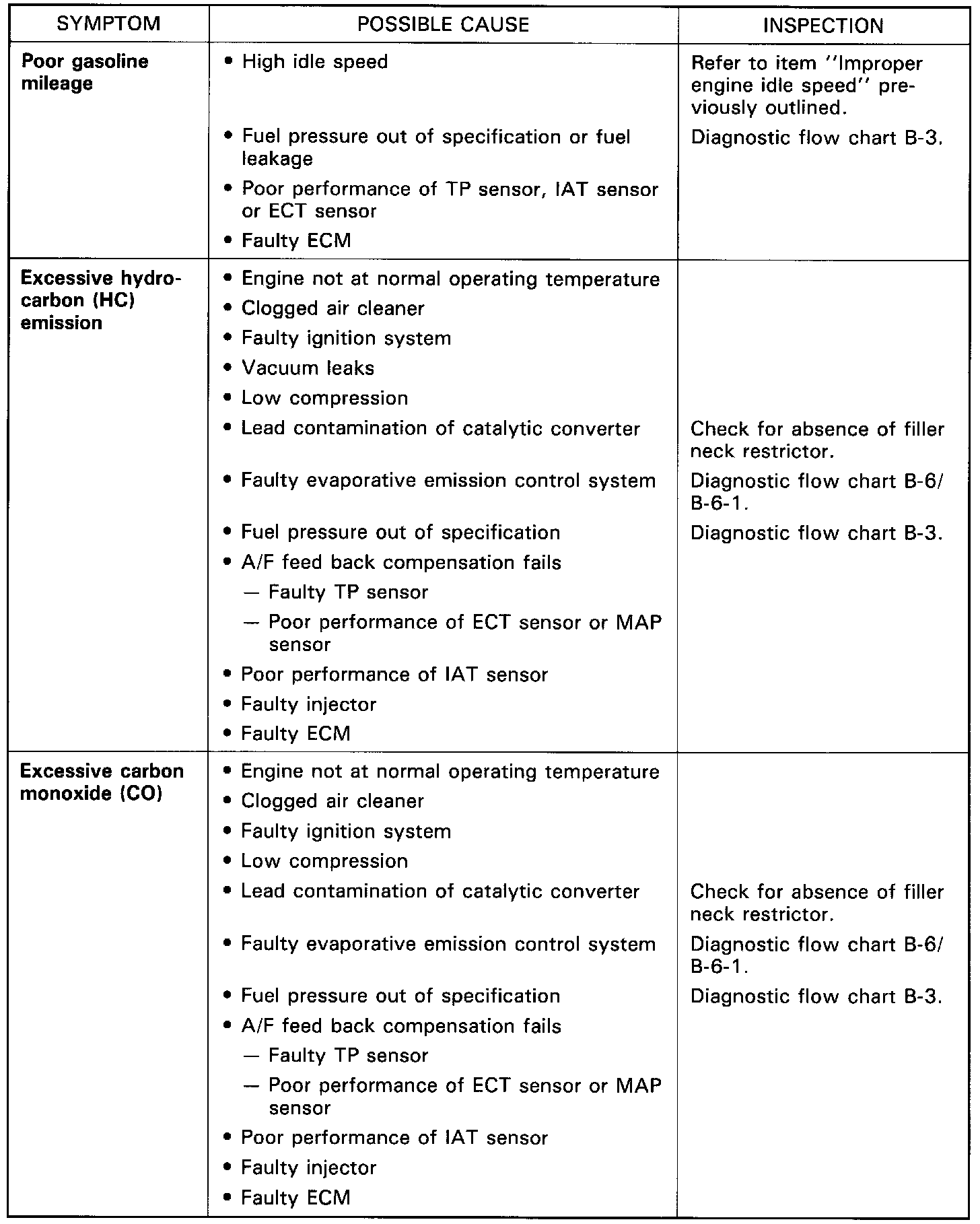 This section describes trouble diagnosis of Electronic Fuel Injection system parts whose trouble is not indicated by the on-board diagnostic system (self-diagnosis function). When diagnostic trouble code No.12 is indicated by the on-board diagnostic system (self-diagnosis function) and assuredly those engine basic parts as described in "ENGINE DIAGNOSIS" are all in good condition, check following Electronic Fuel injection system parts which may be a possible cause for each symptom of the engine.