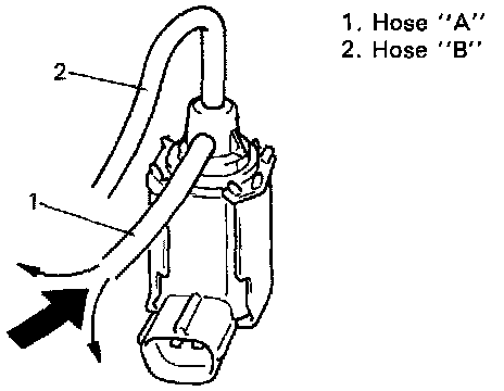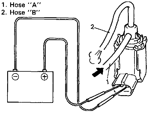 5. Connect 12V-battery to EVAP canister purge valve terminals. In this state, blow hose "A". Air should come out of hose "B".