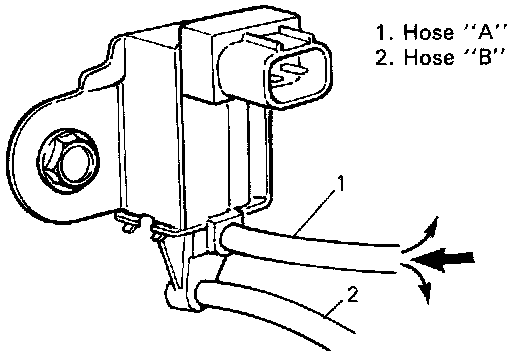 5. Connect 12V-battery to EVAP canister purge valve terminals. In this state, blow hose "A". Air should come out of hose "B".