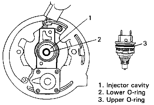 1. Apply thin coat of spindle oil or gasoline to new upper and lower 0-rings, install lower 0-ring to injector cavity and upper 0-ring to injector.