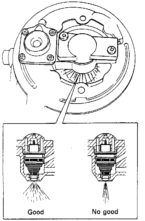 5. Check that fuel is injected out in conical shape from fuel injector when cranking or running engine. If no fuel is injected, check wiring harness for continuity and couplers for proper connection referring to "Diagnostic Flow Chart B-1". If fuel is not injected out in conical shape, replace injector.