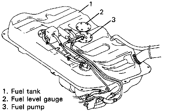 The fuel tank is located under the rear of the vehicle. The fuel pump and fuel level gauge are installed on the upper part of fuel tank. Whenever servicing the fuel level gauge or the fuel pump, the fuel tank must be removed from the body.