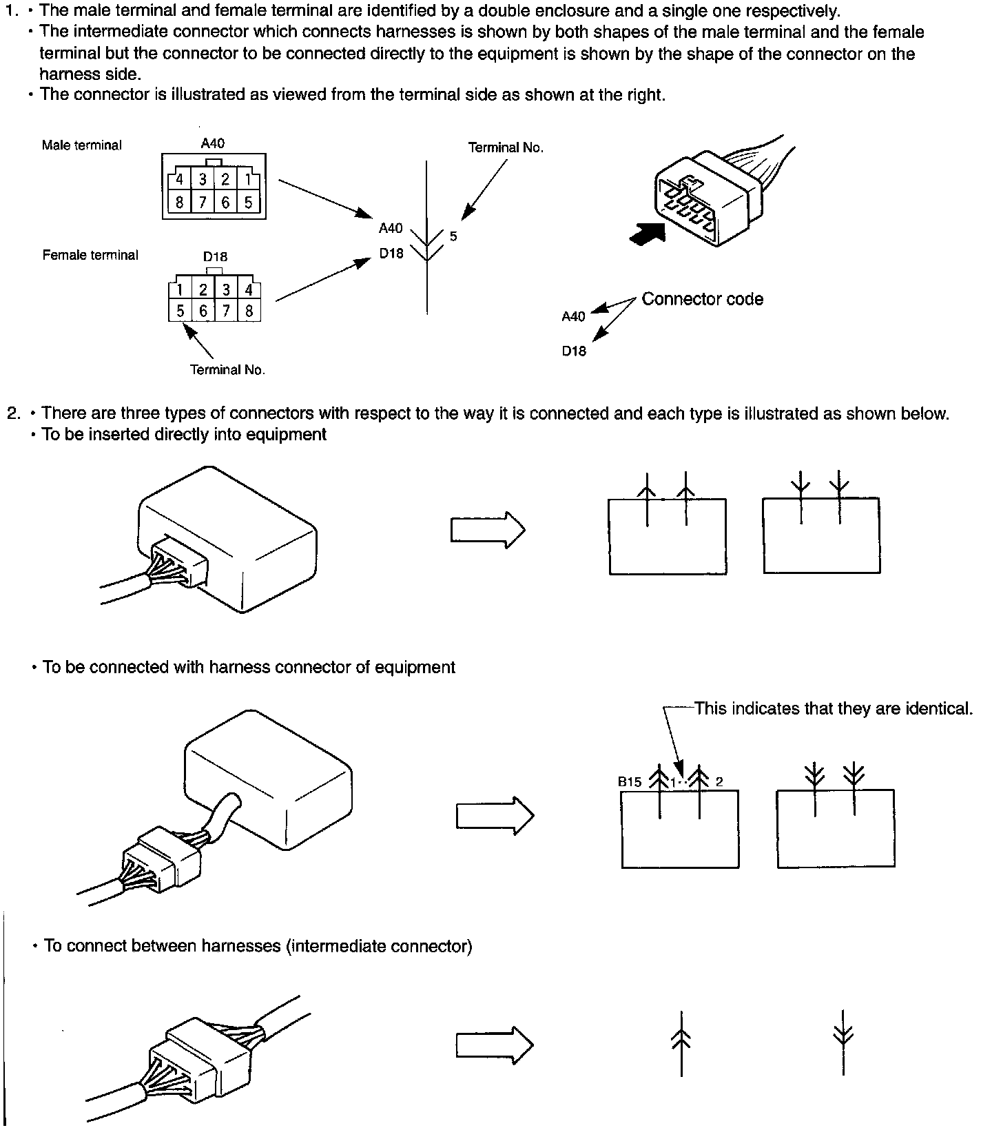 The connectors are indicated as shown in the image in System Circuit Diagram. For the shape and pin arrangement of each connector used, see the List Of Connectors. Described in the image are how they are indicated and how to read them.