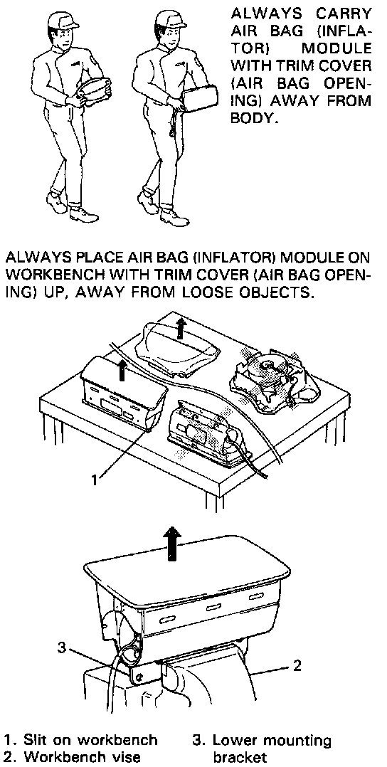 - When carrying a live air bag (inflator) module, make sure the bag opening is pointed away from you. In case of an accidental deployment, the bag will then deploy with minimal chance of injury. Never carry the air bag (inflator) module by the wires or connector on the underside of the module. When placing a live air bag (inflator) module on a bench or other surface, always face the bag up, away from the surface. As the live passenger air bag (inflator) module must be placed with its bag (trim cover) facing up, place it on the workbench with a slit or use the workbench vise to hold it securely at its lower mounting bracket. This is necessary so that a free space is provided to allow the air bag to expand in the unlikely event of accidental deployment. Otherwise. personal injury may result.