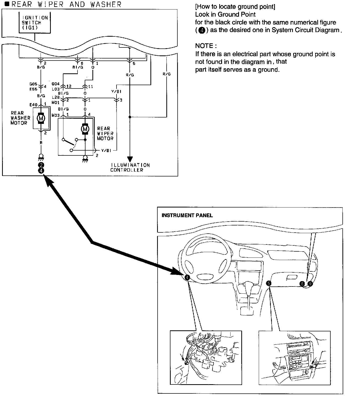 Ground points means the position where the negative harness among wiring harnesses is grounded. In the system circuit diagram, there are many ground marks followed by black circles with numerical figures in them which means that the end of the harness with such black circles is grounded to some part of the vehicle.