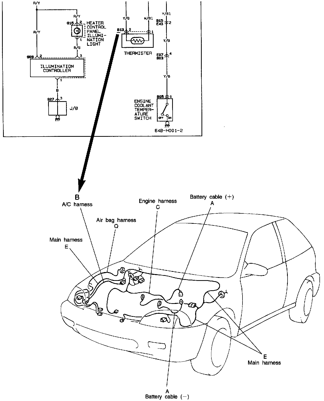 In the system circuit diagrams, alphabets (A, B, ..) are used as shown in the image. Alphabets are assigned to wiring harnesses in one to one correspondence so that if you know the alphabet, the harness name and its location in the vehicle can be retrieved simply by finding the same alphabet in the Harness Routing Diagram.