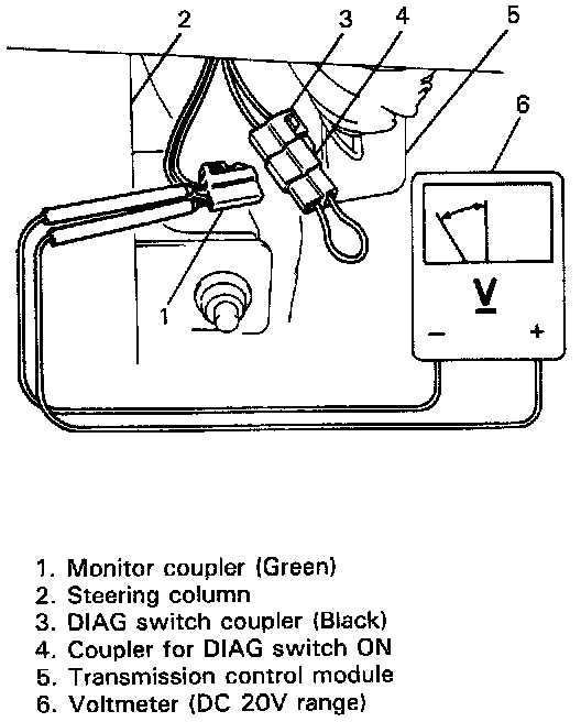 2. Connect voltmeter probes to monitor coupler (green coupler) under dash panel beside steering column at the right.