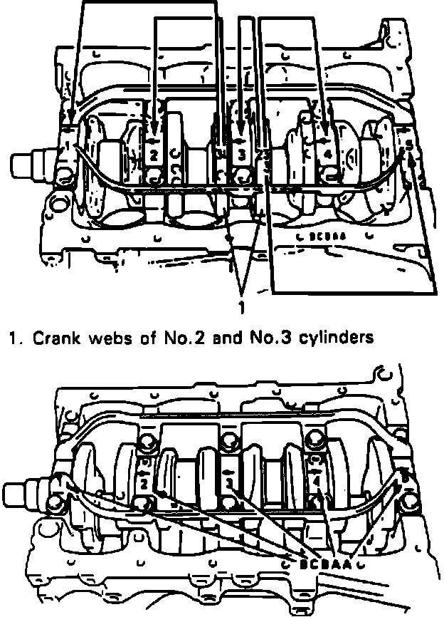 4. Using numbers stamped on No. 2 and No. 3 crank webs and letters stamped on mating surface of cylinder block, determine new bearing to be installed using chart in Fig. 33.