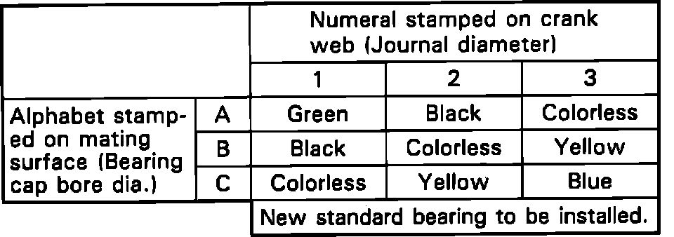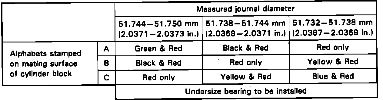 Main bearings also come in 0.25 mm undersize, available in five thicknesses distinguished by paint marks as follows: green and red, 0.0835-0.0836 inch; black and red, 0.0836-0.0837 inch; red, 0.0837-0.0838 inch; yellow and red, 0.0838-0.0839 inch and blue and red, 0.0939-0.0840 inch.