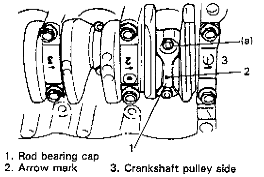 5. Install bearing cap: Point arrow mark on cap to crankshaft pulley side. Tighten cap nuts to specification.