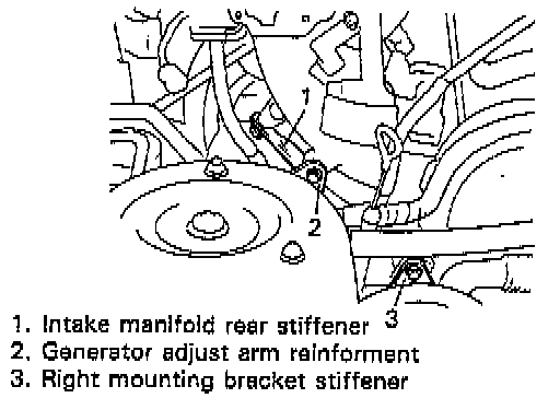 5. Remove intake manifold rear stiffener bolt, generator adjust arm reinforcement bolt and right mounting bracket stiffener bolt from intake manifold.