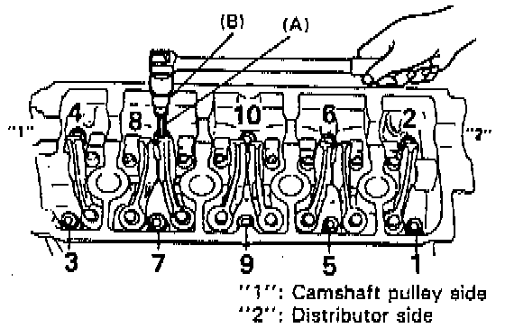 15. Loosen cylinder head bolts in such order as indicated in image and remove them.