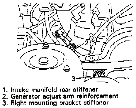 8. Remove intake manifold rear stiffener bolt, generator adjust arm reinforcement bolt and right mounting bracket stiffener bolt from intake manifold.