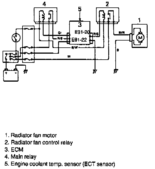 This system controls operation (ON/OFF) of the radiator fan motor. Radiator fan motor is turned ON and OFF by its relay which ECM controls.