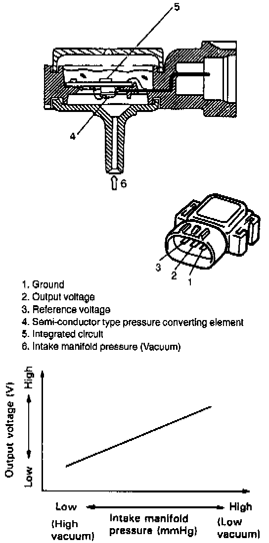 This sensor senses pressure change in the intake manifold and converts it into voltage change. It consists of a semi-conductor type pressure converting element which converts a pressure change into an electrical change and an integrated circuit which amplifies and corrects the electric change. The ECM sends a 5-volt reference voltage to the pressure sensor. As the manifold pressure changes, the electrical resistance of the sensor also changes. By monitoring the sensor output voltage, ECM knows the manifold pressure (intake air volume). ECM uses the voltage signal from the pressure sensor as one of the signals to control various devices.