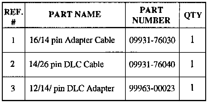 This bulletin is to inform you of the change in the Data Link Connector (DLC) for the vehicles listed above. The pin configuration on the DLC has been modified from a 12 pin to a 16 pin connection to conform to the OBD II (On-Board Diagnostics II) system requirements. As a result of this change, a new Tech-1A adapter is now available to adapt your Tech-1A to the updated connector. If your Tech-1A needs this new adapter, please use the part numbers as listed in this bulletin.