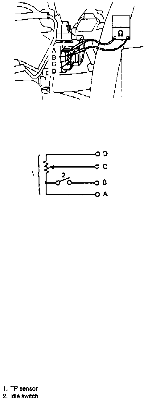 1. Disconnect negative cable at battery and coupler from TP sensor.2. Using ohmmeter, check resistance between terminals under each condition given in table above. If idle switch check result is not satisfactory, adjust installation angle of TP sensor and if found defective in the other check, replace TP sensor.