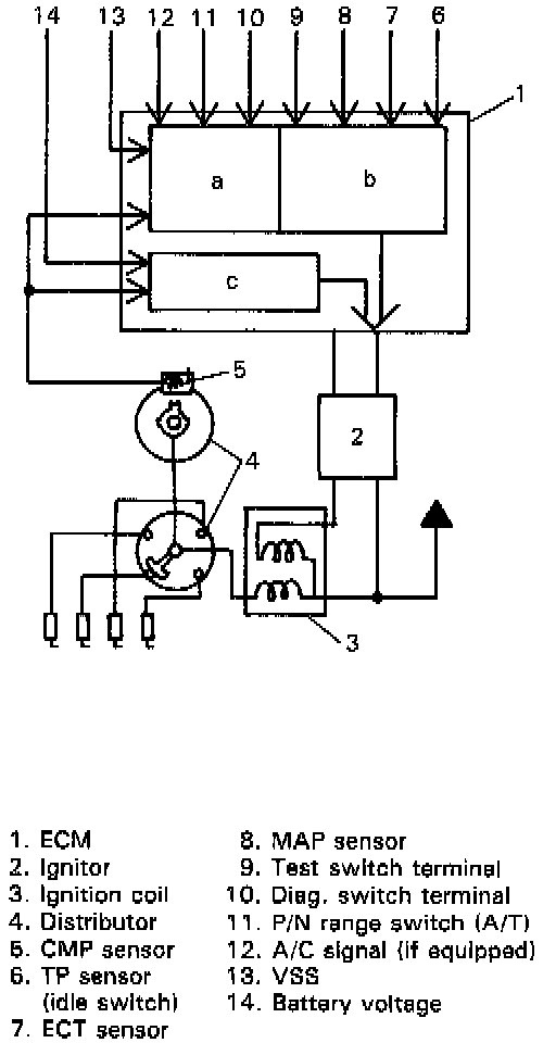 This system controls electronically the time of electric current flow to ignition primary coil as well as ignition timing. ECM judges the engine condition by using signals from various sensors, selects the most suitable electric current flow time and ignition timing for that engine condition from among those prestored in its memory and sends an ignition signal to the igniter (power unit). Control of this system includes three different types as follows.