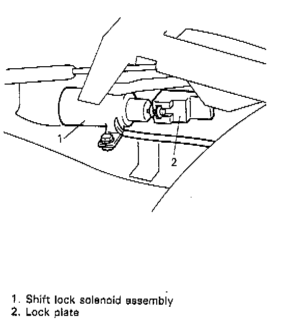 ^ Check to confirm that lock plate is pulled in when ignition key is turned to "ON" and brake pedal is depressed, so allowing detent pin to be pushed down.