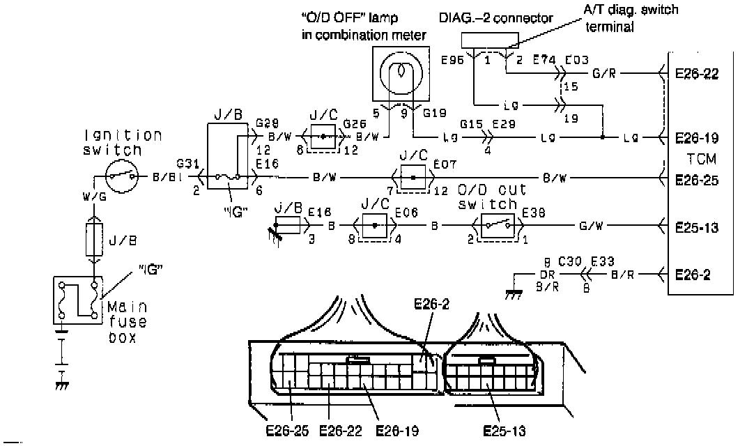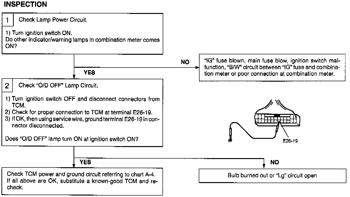 Operation (ON/OFF) of the "O/D OFF" lamp is controlled by transmission control module (TCM). When the ignition switch is turned ON with the O/D cut switch OFF (switch button is pushed) and malfunction is not detected, TCM turns the "O/D OFF" lamp ON only for 2 sec. to check the bulb and turns it OFF. When ignition switch is turned ON regardless of engine running or not and malfunction is detected, the "O/D OFF" lamp is blinked by TCM to warn the driver of such occurrence of trouble. When A/T diagnosis switch terminal is grounded by using service wire for DTC check, the "O/D OFF" lamp indicates DTC by blinking pattern.