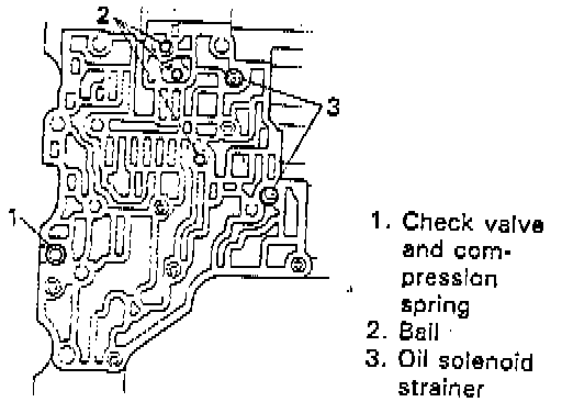 2. Place check balls, check valve, solenoid strainers. compression spring and oil